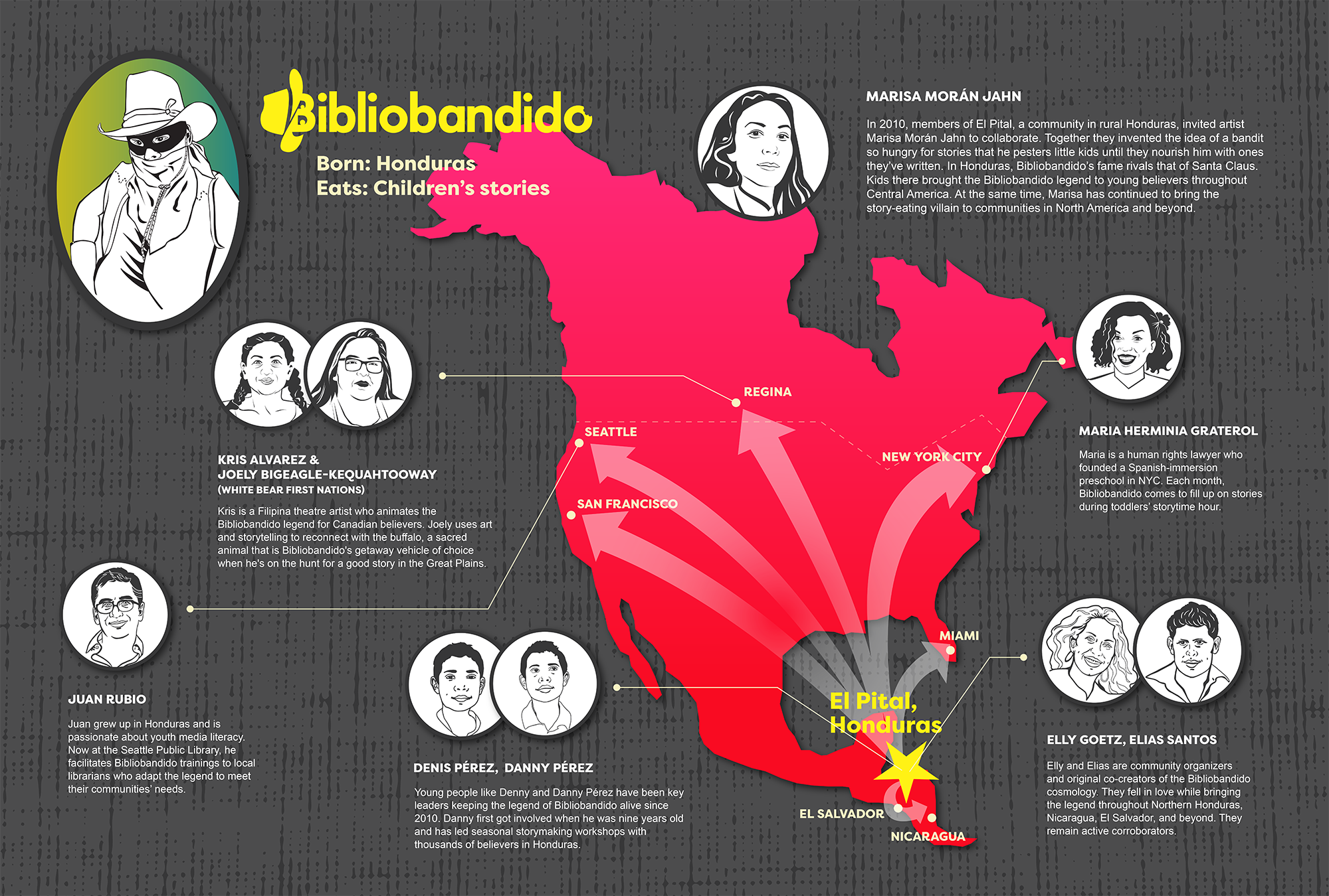 Bibliobandido is a public art and literacy movement that centers around ‘Bibliobandido’ (’story eater’), a masked bandit that eats stories and playfully pesters little kids to nourish him with stories they’ve written. As Bibliobandido’s fame eventually rivaled that of Santa Claus, the project grew over a decade to encompass hundreds of youth across 19 participating Honduran communities and the Americas. Bibliobandido workshops also spread to Central and North America, taking root in institutions ranging from the Seattle Public Library, Pérez Art Museum Miami, Studio Museum in Harlem, Sugar Hill Museum of Art and Storytelling, Queens Museum, and additional universities, festivals, schools, and museums where storytelling is urgent. In 2015, the Seattle Public Library adopted Bibliobandido as the mascot of their digital media programs and provide trainings to librarians on how to adapt the legend for their own communities. Read more in ArtForum.